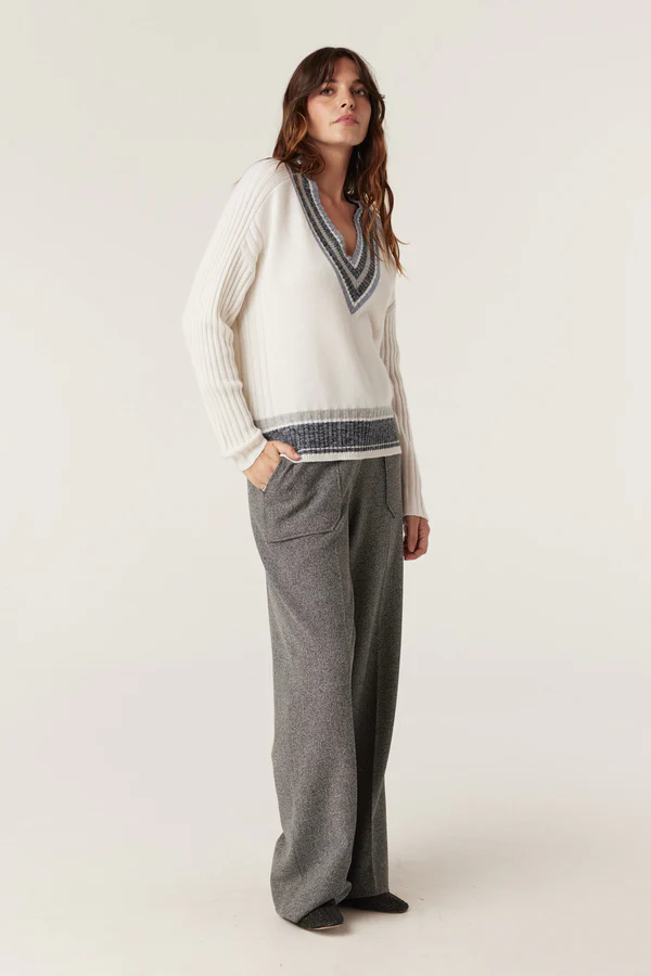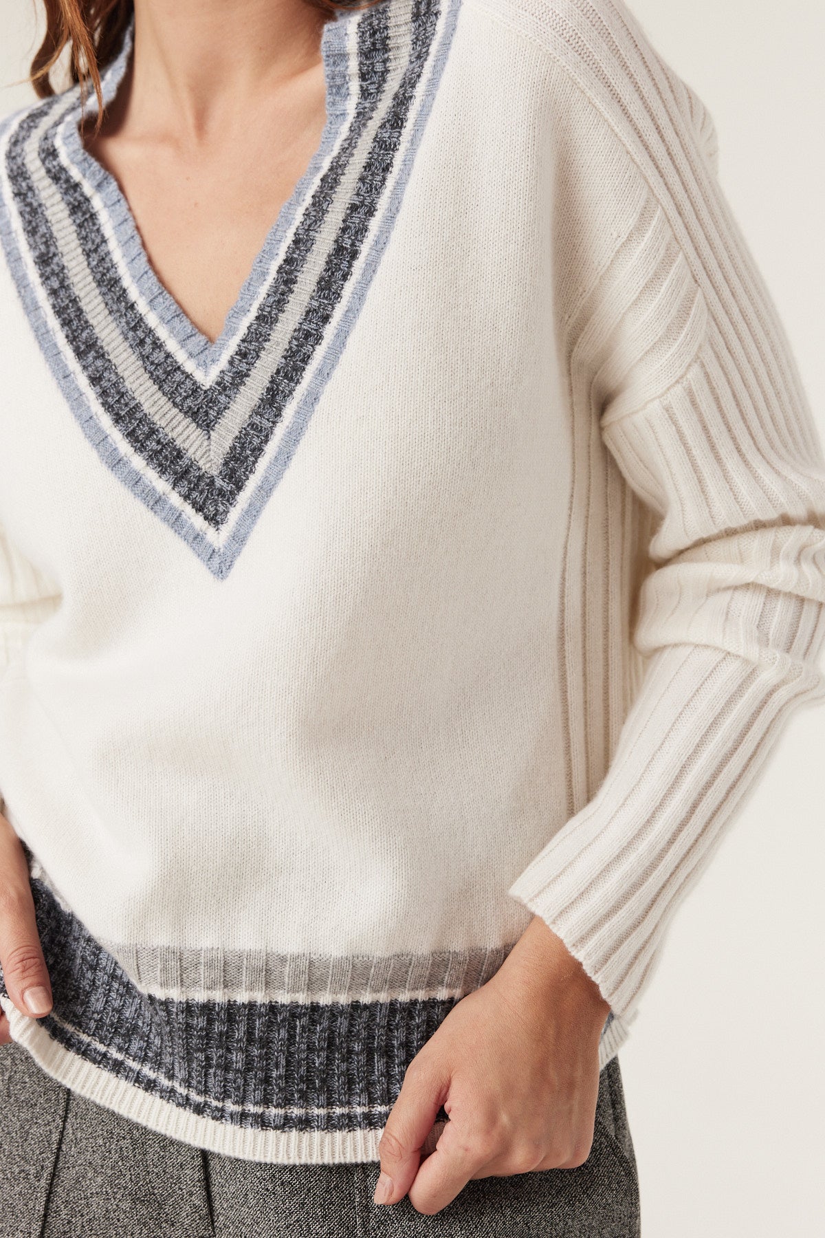 The Cashwool Varsity Jumper is a regular fit, medium-weight knit featuring wide rib detailing along the shoulder, side seams, and sleeves. Designed with a V-neckline, it is finished with a multi-colour contrast stripe trim at the neck and hem.