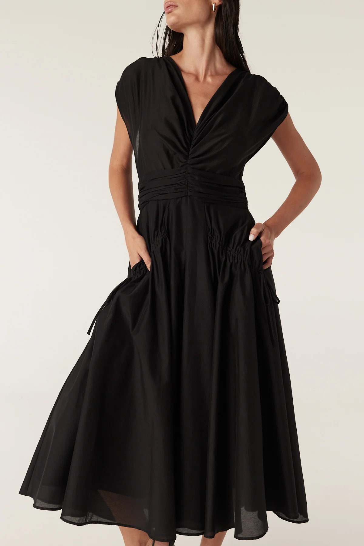 he Layla Midi Dress features a fit-and-flare silhouette with soft gathers at the front V-neck and waist. It has rouching details with ties on the low hip and an invisible back zip. Made from sheer silk / cotton voile with a cotton lining.