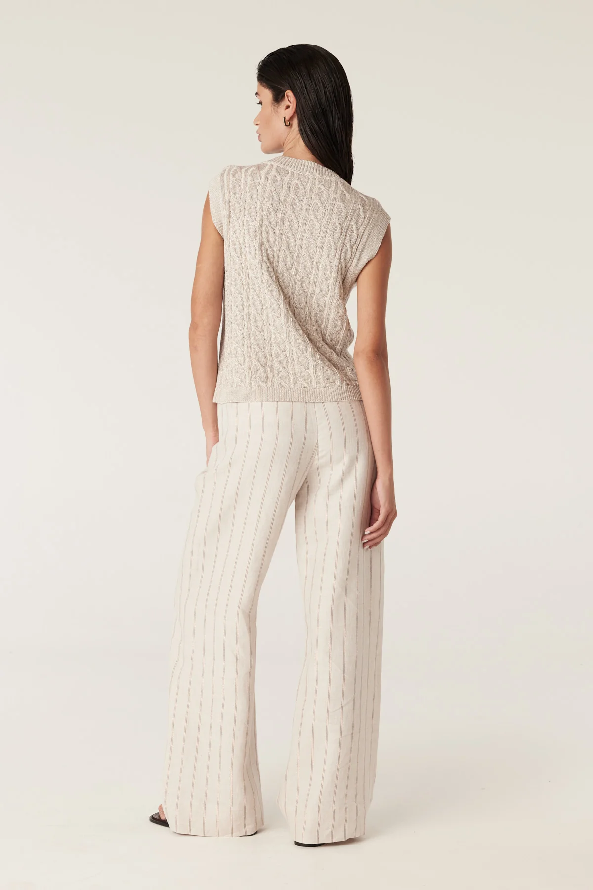 The Lumen Cable Vest is a regular fit style in a medium weight knit. Made from a sustainable yarn with a metallic thread for a subtle shimmer, it showcases an all-over cable stitch with a classic crew neckline and centre front button closure.