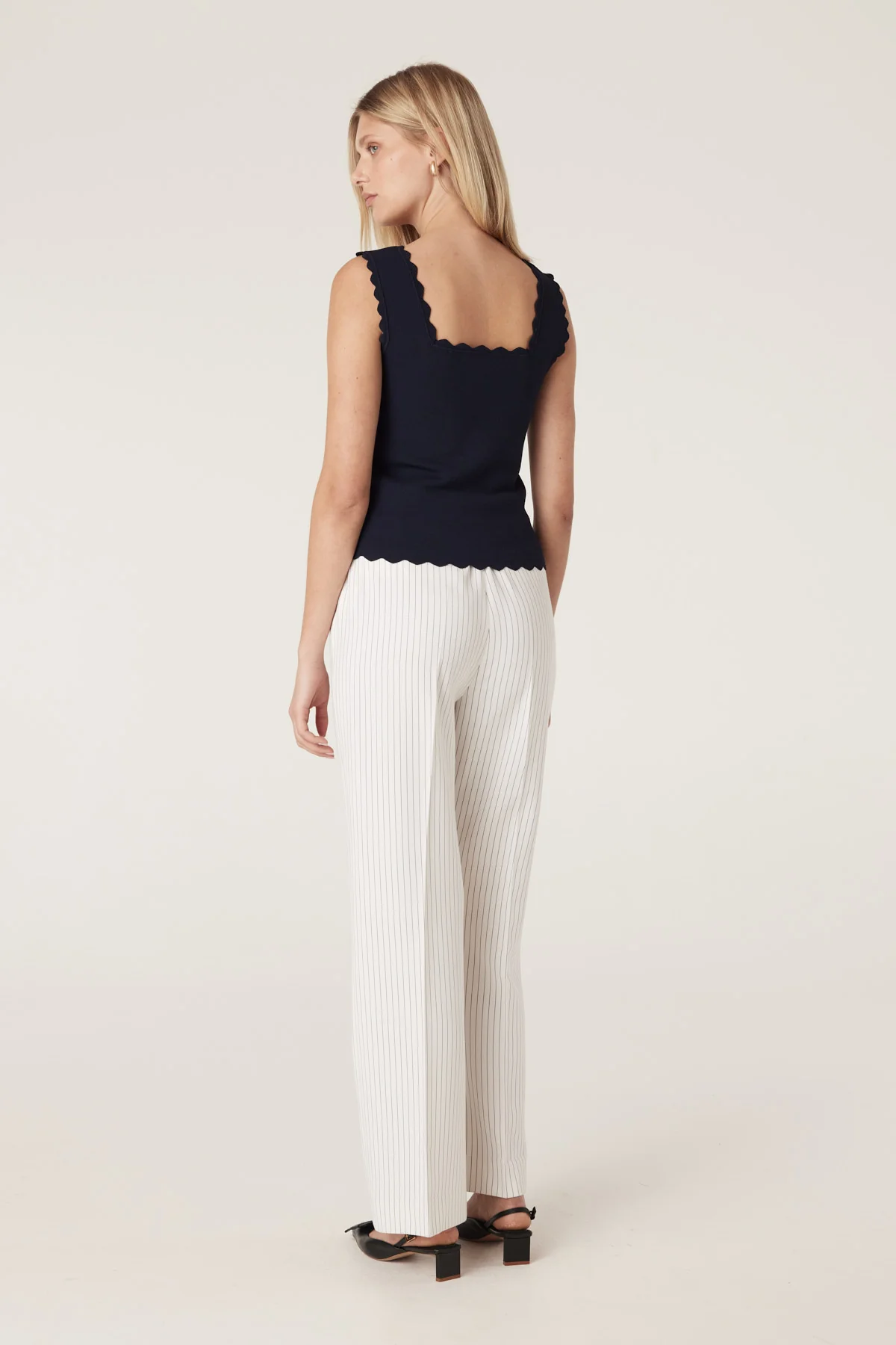 The Tate Pinstripe Pant is a regular fit, straight-leg style designed to pair with the matching Leopold Blazer. Featuring a front zip fly and elasticated back waist, it includes functional front pockets and mock back pockets for a clean finish.