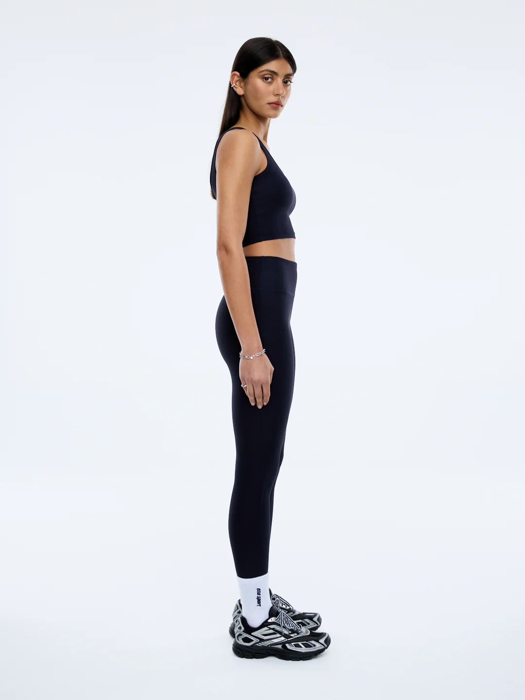 The Athleisure Rib Legging is cut from recycled nylon stretch rib that holds shape while moving with you. Designed with a high waist and self-fabric waistband for a streamlined, supportive finish.