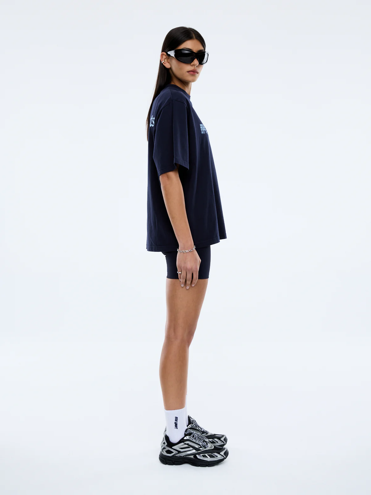 The Pelly Sports League Tee in navy cotton jersey delivers an oversized street-inspired silhouette. Finished with plastisol prints front and back for a bold, team-style expression.