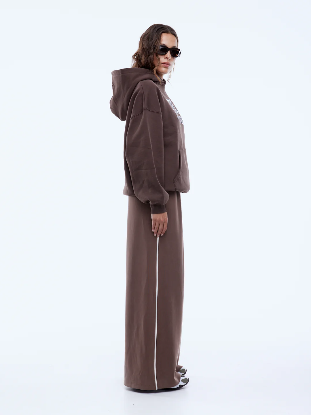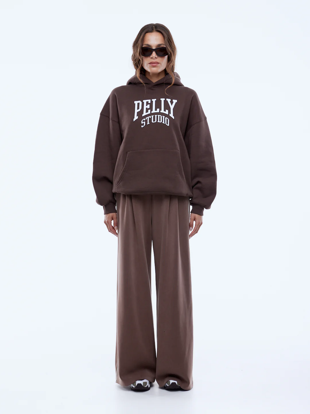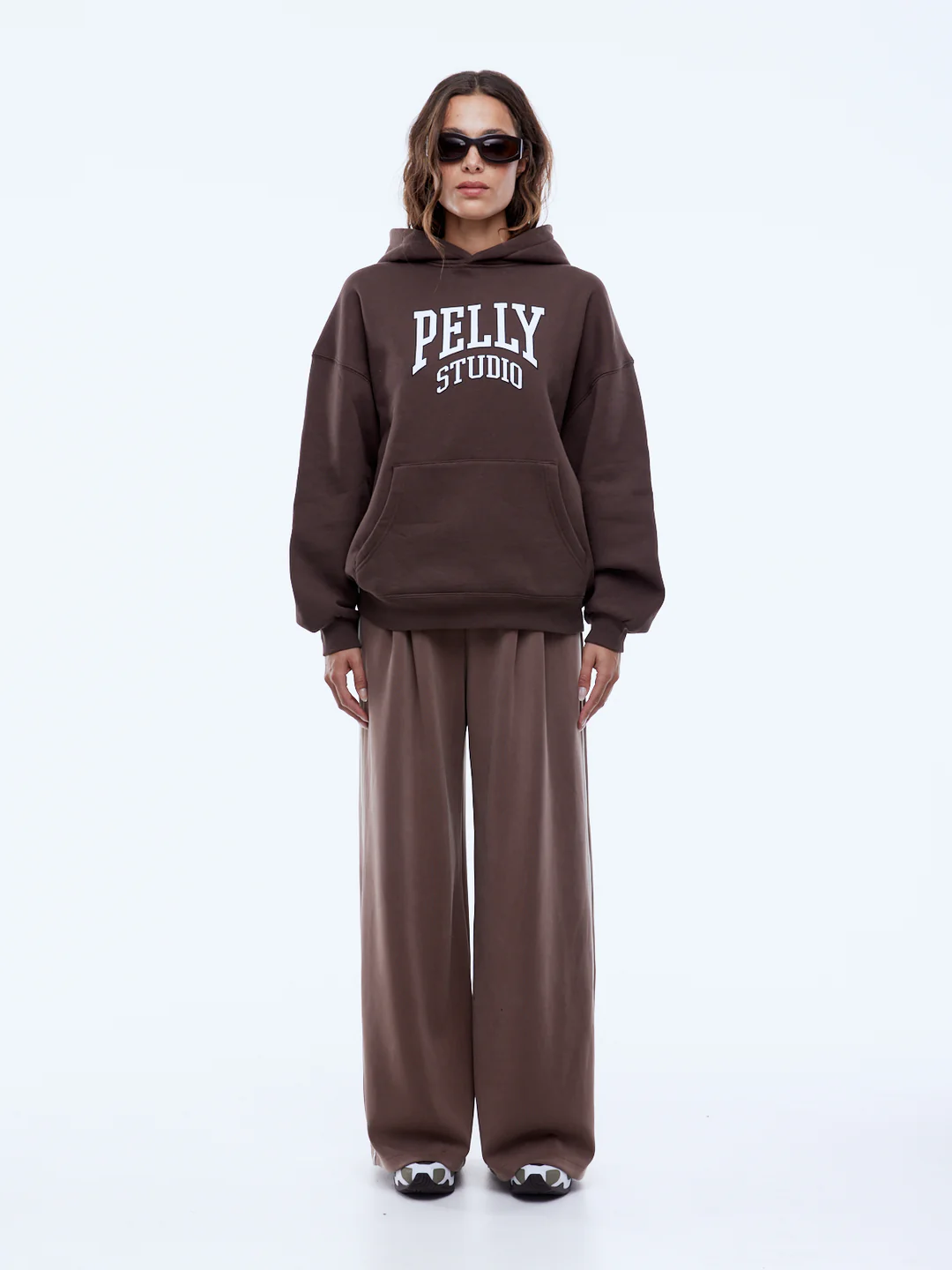 The Pelly Studio Hoodie is crafted from brushed cotton-rich fleece in mocha with an oversized, drop-shoulder fit. Designed with a tonal collegiate-inspired graphic and contrast outline, it offers a refined take on casual layering.