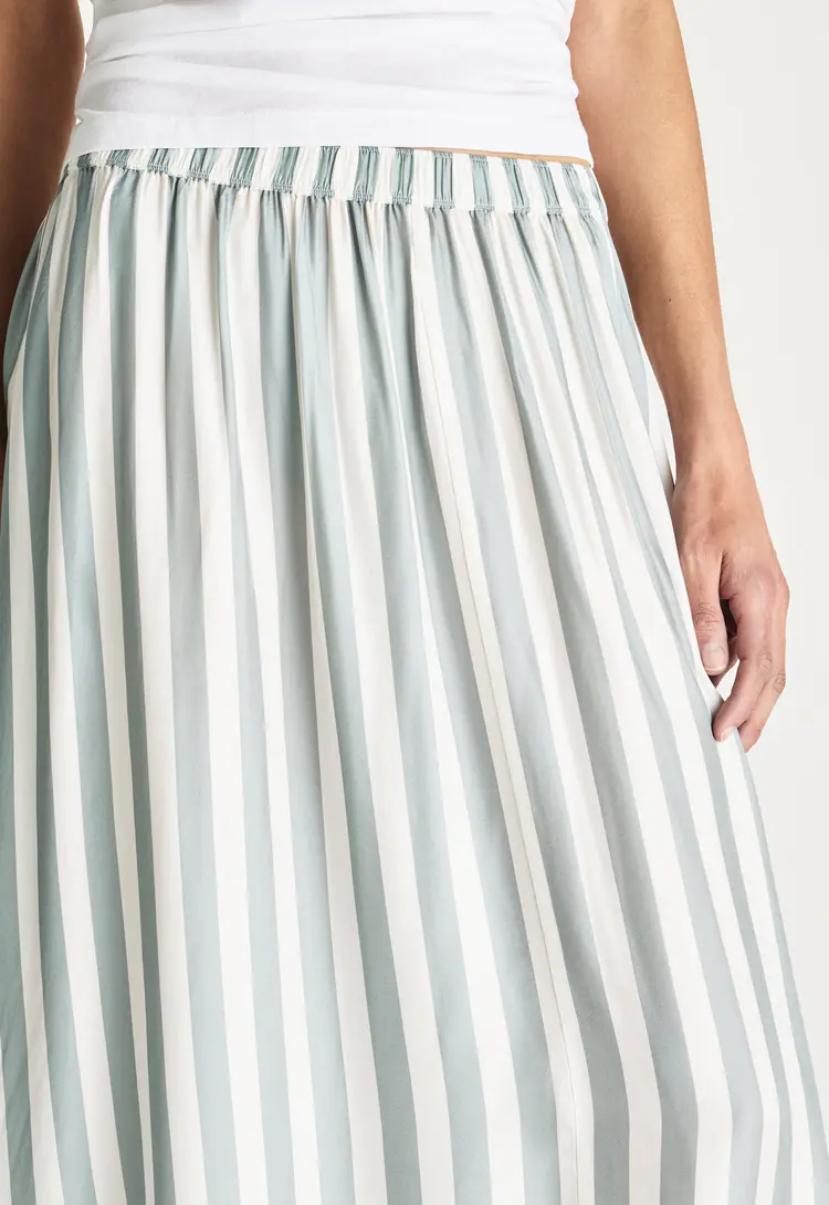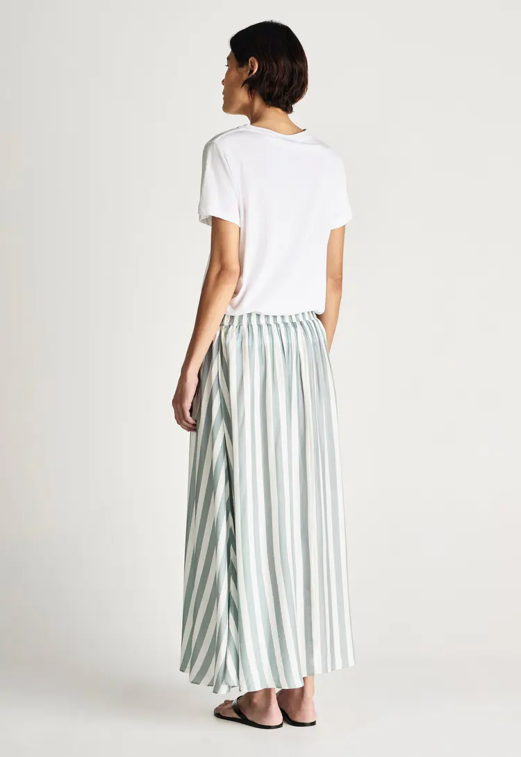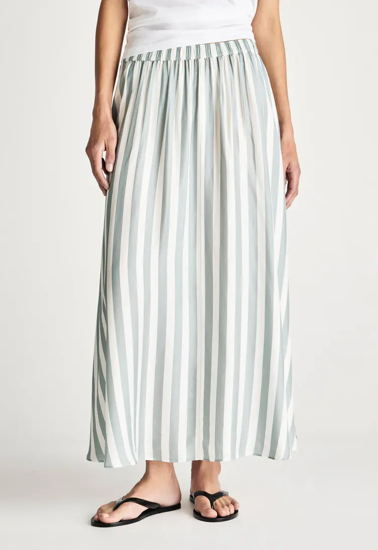 This silk-viscose skirt features a soft drape and subtle sheen, printed with Jac + Jack’s own custom stripe design in our own unique and nuanced colours. Light and fluid, it brings an elevated yet effortless feel, ideal for refined summer pieces with a touch of individuality.