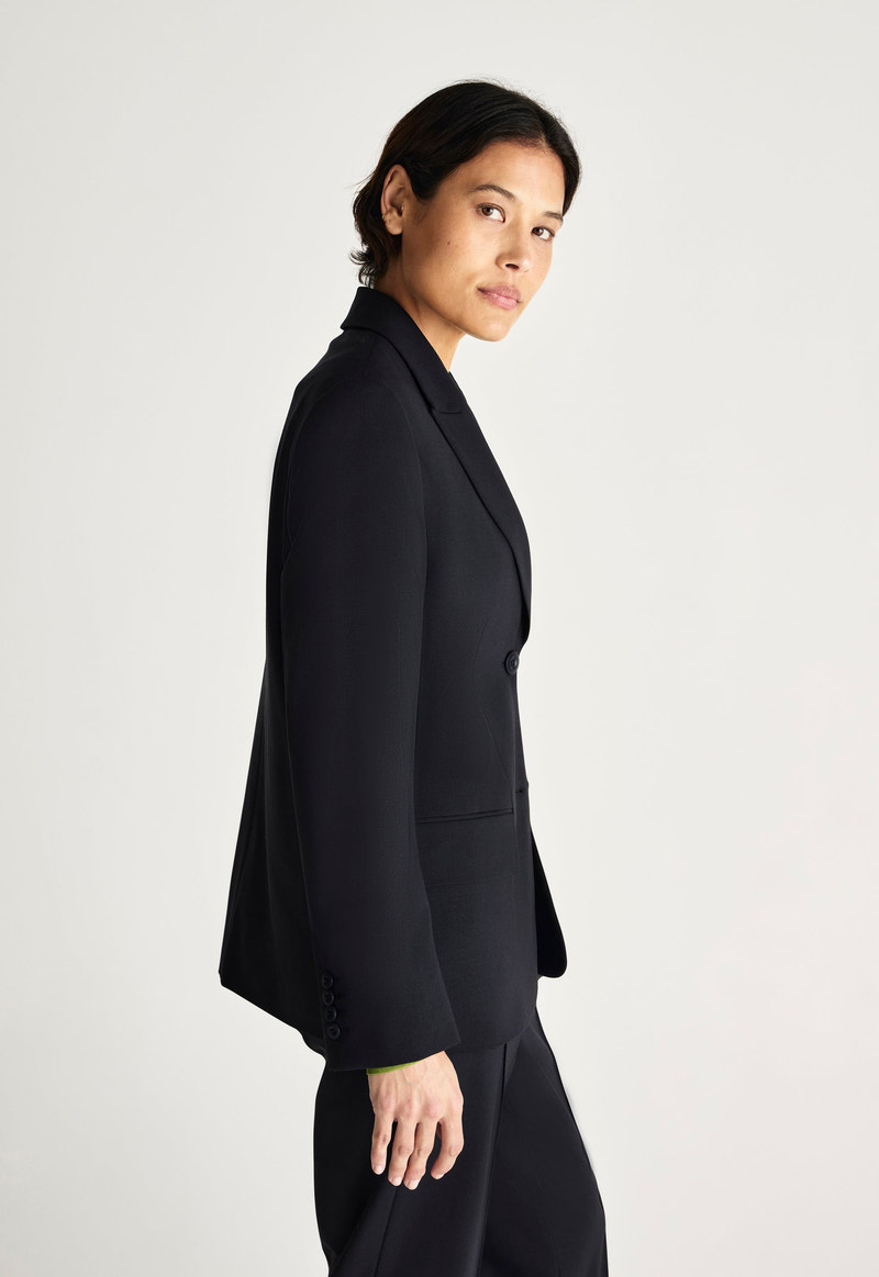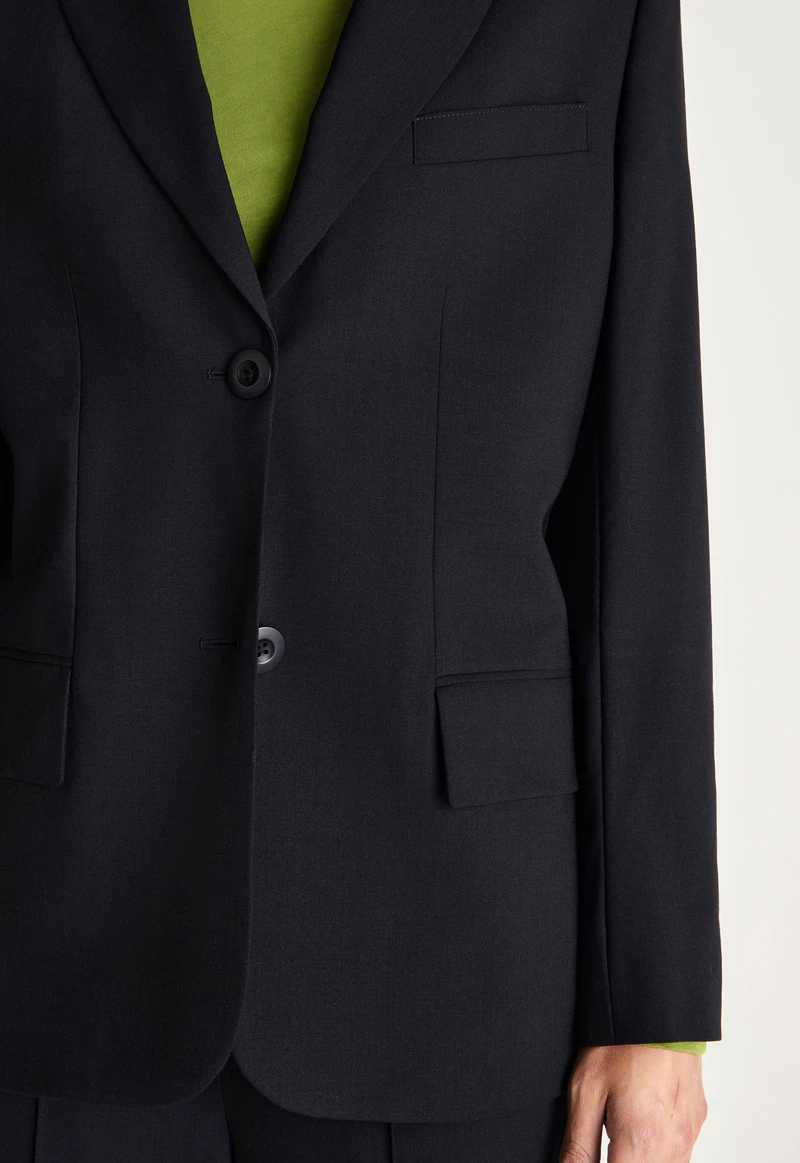 – Front and chest pockets, classic lapel, two-button closure, Corozo buttons at cuffs