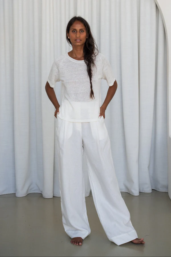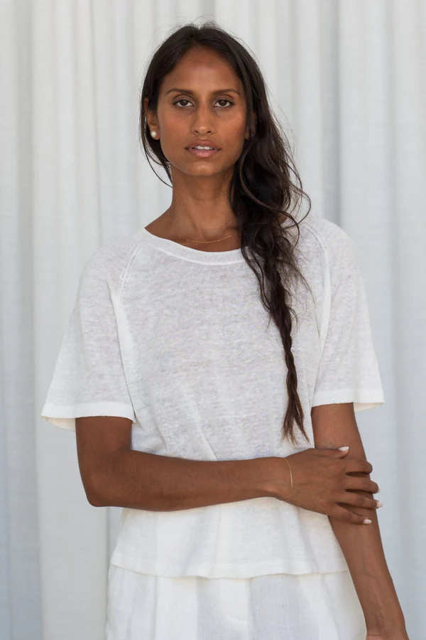 GRACE is the kind of top that does it all – sheer, soft, and featherlight, she’s knitted from the finest 100% European linen yarn for that silky soft feel. With a relaxed fit, raglan short sleeves, and a minimal silhouette, she’s easy to dress up or down. Petite and curvy bust friendly, GRACE is the effortless layer your wardrobe’s been waiting for.