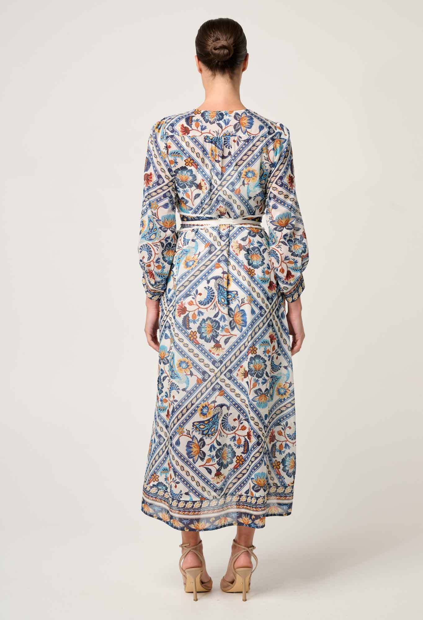 Step into effortless elegance with the Alexis Cotton Silk Midi Dress in Petinos Floros – where artisan-inspired florals meet refined modern tailoring. Crafted from a luxurious silk-cotton blend, this airy midi dress features a botanical mosaic of sun-drenched florals in hues of indigo, terracotta, and marigold. The silhouette is thoughtfully detailed with a contrast trim and a self-tie rope belt to define the waist, creating a flattering and feminine shape. Whether you’re wandering a coastal town or attending a garden soirée, the Alexis dress offers the perfect balance of laid-back grace and elevated charm.