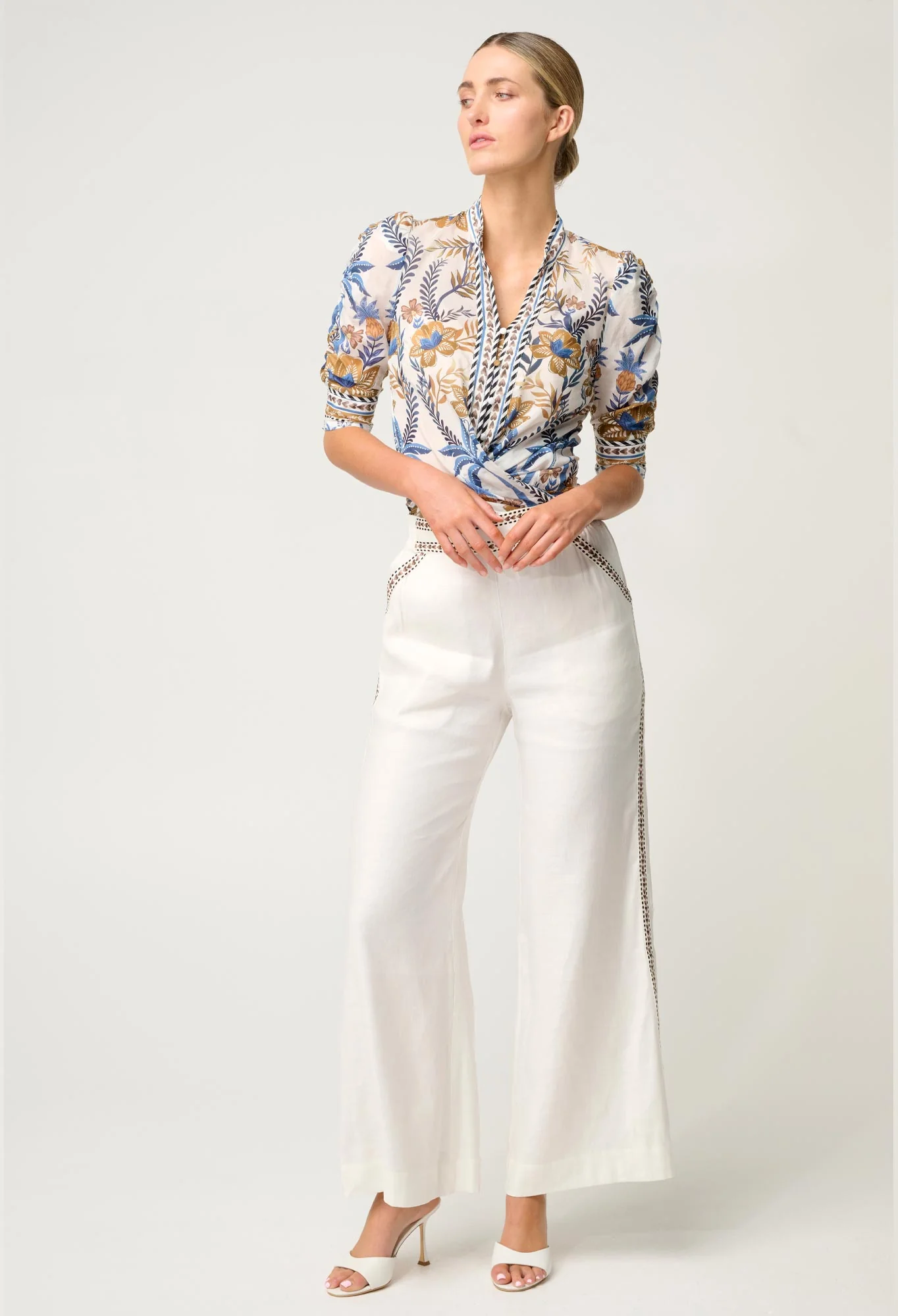 The Golden Medina print—a striking mix of golden florals and deep indigo foliage—creates a timeless statement that’s equal parts modern and bohemian. Featuring a button-down front, soft collar, and gently puffed sleeves, the Calantha shirt is designed for versatile styling. Wear it neatly tucked into tailored pants for polished elegance, or tie it at the waist for a relaxed, feminine silhouette.