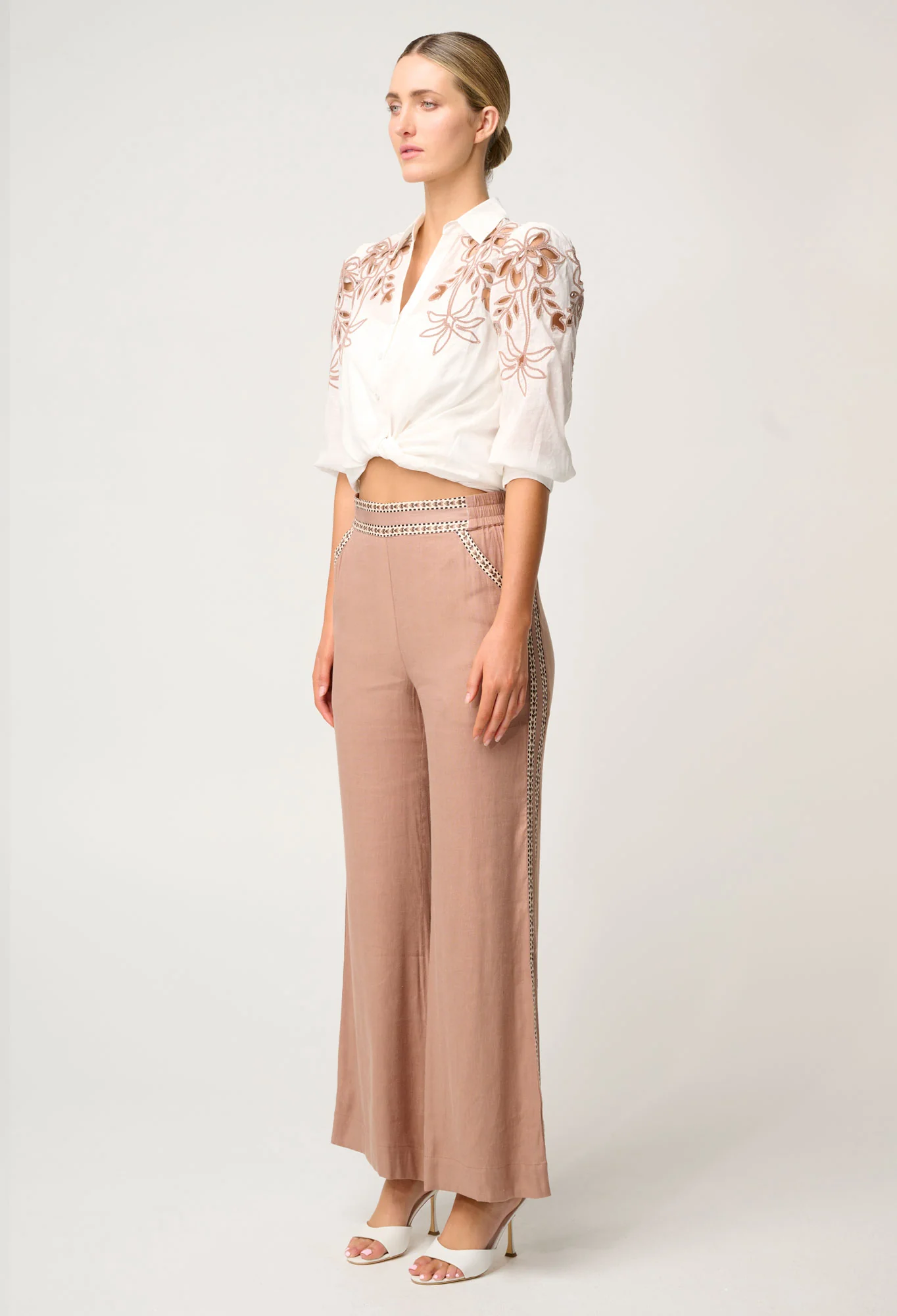 The soft dune hue brings a neutral sophistication that transitions seamlessly from desk to dinner. Featuring a high-rise waistband with delicate lace trim detailing, side pockets, and a flowing wide-leg silhouette, these pants strike the perfect balance between polished tailoring and relaxed charm.