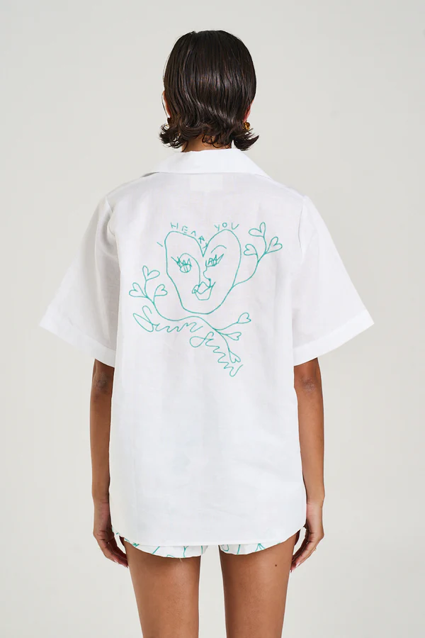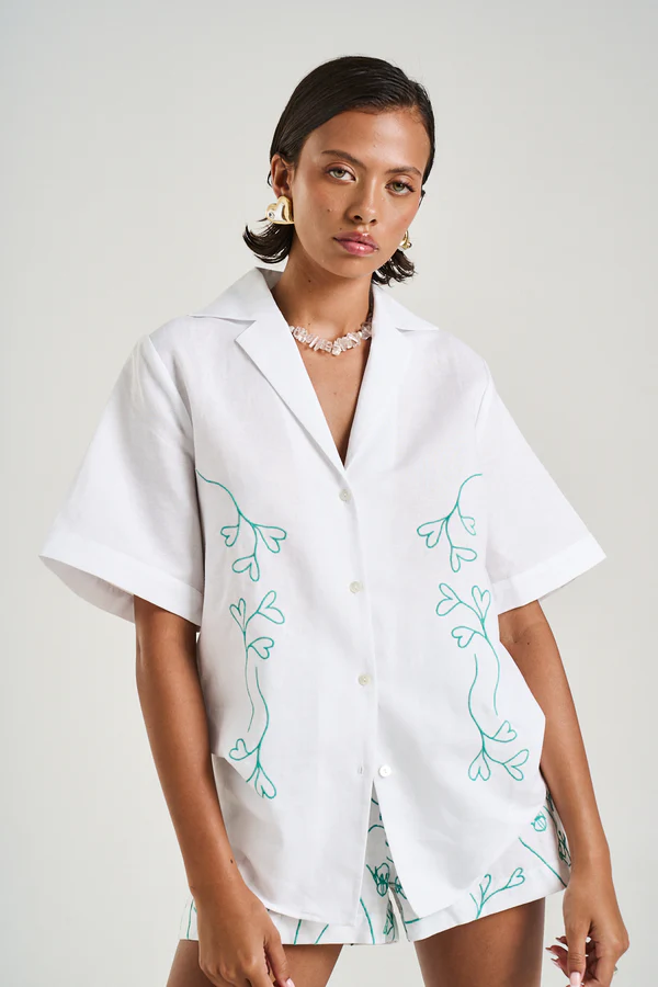 Crafted from a linen blend, the Collared SS Shirt offers a boxy silhouette and features the embroidered I Heart U detail. A refined and polished shirt for everyday wear.