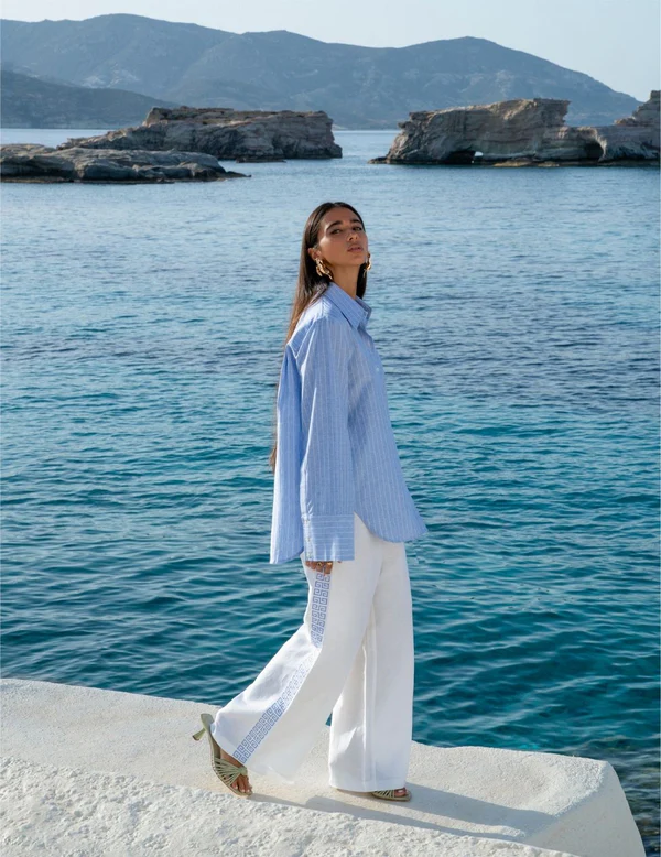 The Cuff Shirt in Sea Stripe made from a cotton / linen blend offers a crisp lightweight design with a structured collar and flared oversized cuffed sleeve.