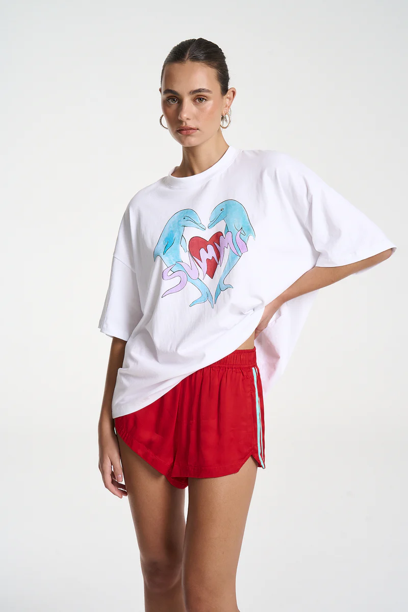 This timeless tee offers a slightly cropped and relaxed fit, highlighted by the hand-painted TROPPO DOLPHINS artwork and SUMMI text.