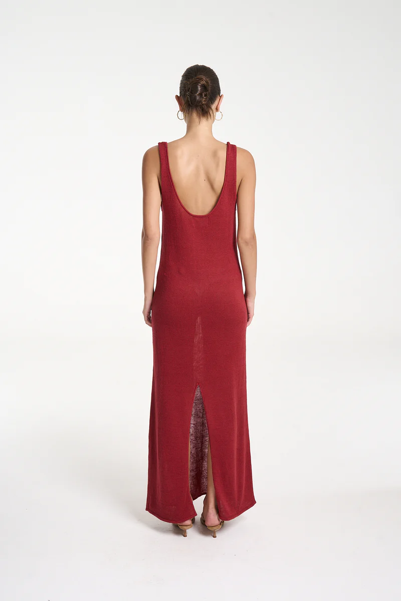 The Knit Maxi Dress in classic carmine red has been crafted from a linen/cotton blend with a scoop neckline and relaxed silhouette that falls all the way to the ankles.