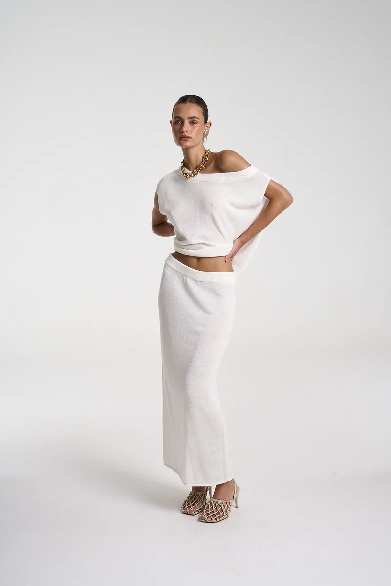 Effortlessly elegant, this Knit Maxi Skirt combines breathable linen and cotton in a refined pencil silhouette. The sheer, lightweight fabric falls beautifully while maintaining its shape. This timeless skirt in classic white is an essential layering piece that transitions seamlessly from casual to sophisticated occasions making it a versatile foundation for any refined wardrobe.